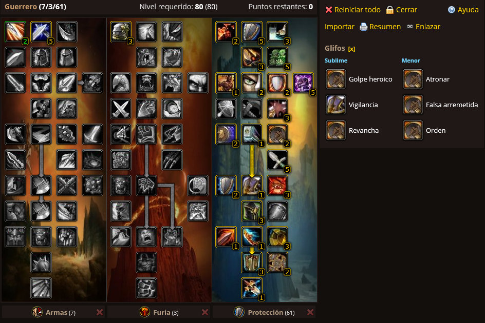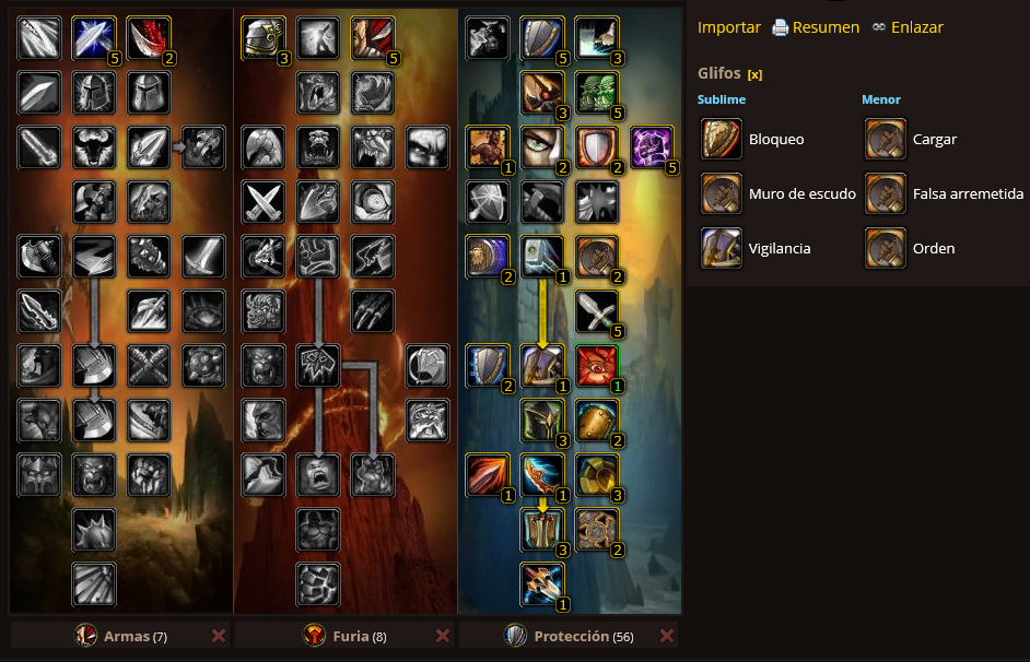 La primera prioriza la generacion de ira para poder lanzar habilidades y agrear con esas habilidades. Los glifos mayores ayudan a gestionar la ira y a tener un flujo redirigido de agro hacia el tanque. Los menores sirven mas para dar soporte a la raid. Estos talentos se usarian en tanque que se estarian armando hasta que se consiga al menos el t9.